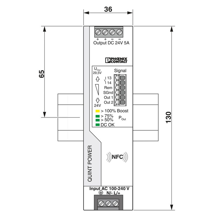 Primary-switched QUINT POWER power supply with free choice of output characteristic curve, SFB (selective fuse breaking) technology, and NFC interface, input: 1-phase, output: 24 V DC/5 A