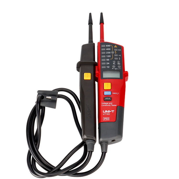 UT18 series are designed for testing AC/DC voltage, 3-phase voltage, phase sequence, continuity, and more. This series is categorized as CAT IV 600V and meets IP65 standard. These voltage testers are perfect tools for electricians to quickly measure voltage levels in all environments.