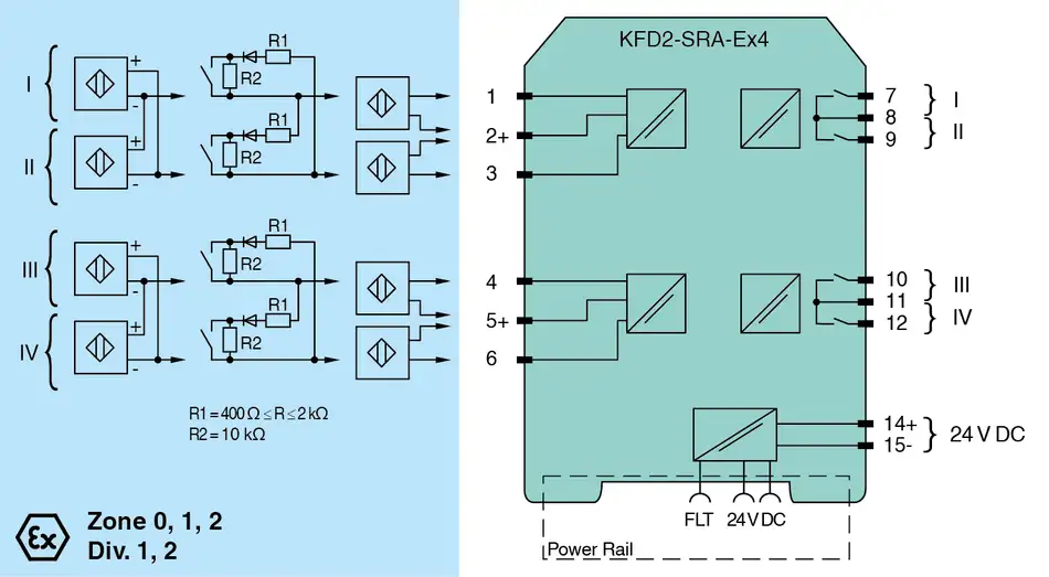 Pepperl+Fuchs KFD2-SRA-Ex4 Switch Amplifier 4-channel isolated barrier 24 V DC supply (Power Rail) Dry contact or NAMUR inputs 50 % less wiring, 2:1 technology Relay contact output Line fault detection (LFD) Reversible mode of operation www.pepperl-fuchs.com/en/products-gp25581/35550