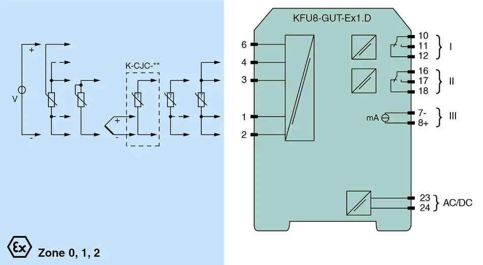 Pepperl+Fuchs KFU8-GUT-Ex1.D Temperature Converter with Trip Values 1-channel isolated barrier Universal usage at different power supplies Thermocouple, RTD, potentiometer or voltage input Redundant TC input Current output 0/4 mA ... 20 mA 2 relay contact outputs Configurable by PACTware or keypad Line fault (LFD) and sensor burnout detection Up to SIL 2 acc. to IEC/EN 61508 / IEC/EN 61511 www.pepperl-fuchs.com/en/products-gp25581/48364
