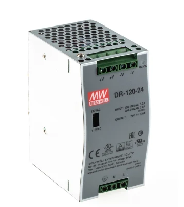 MEAN WELL DR Switched Mode DIN Rail Power Supply, 88 → 132V ac ac Input, 24V dc dc Output, 5A Output, 120W twen.rs-online.com/web/p/din-rail-power-supplies/0282502?srsltid=AfmBOoqhR0prdR1KiZ488sXwRhYcqx9koN8yZ3DGRz33ukzceOA5doHQ